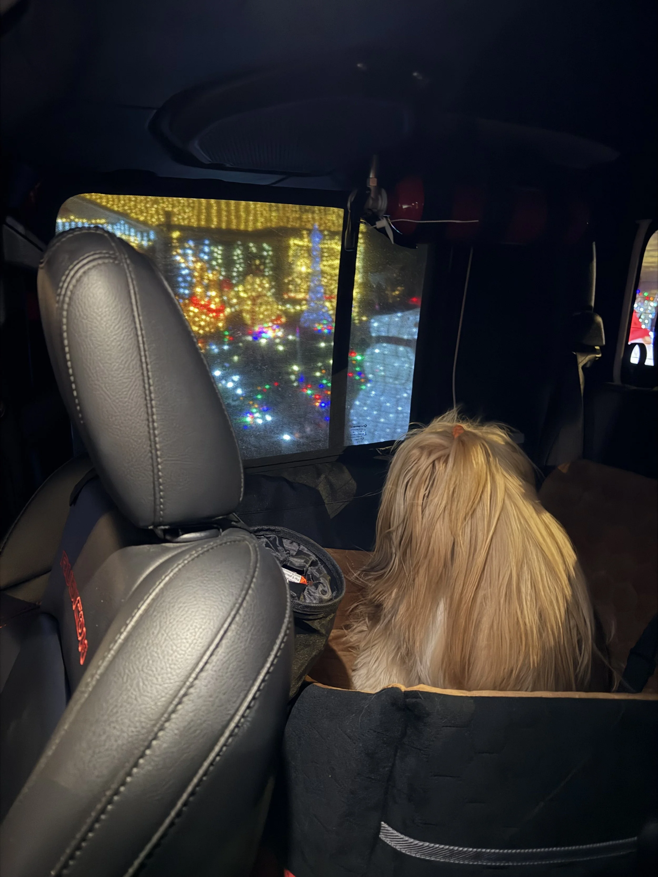 Our first trip involved a shopping trip into town, choosing the dog-friendly stores to spend my money in. On the way home, I asked the dog if she wanted to go and see the lights in town. She got really excited and enjoyed the drive. However, I’m not sure if Coco prefers the lights or the many inflatable Christmas lawn decorations.